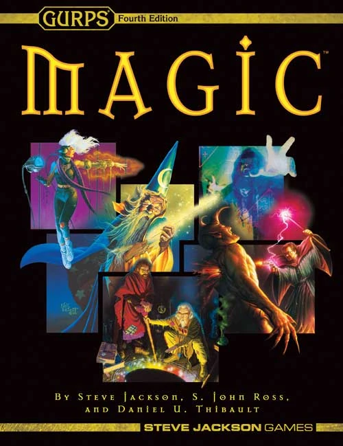 GURPS Magic is a 240 page rulebook for GURPS 4th Edition with content by Steve Jackson, S. John Ross and Daniel U. Thibault. Most of the spells are slightly reworked versions of Classic Edition spells from GURPS Classic Magic, GURPS Grimoire, and a few other places. Additional information for magic appears in GURPS Fantasy and GURPS Thaumatology.